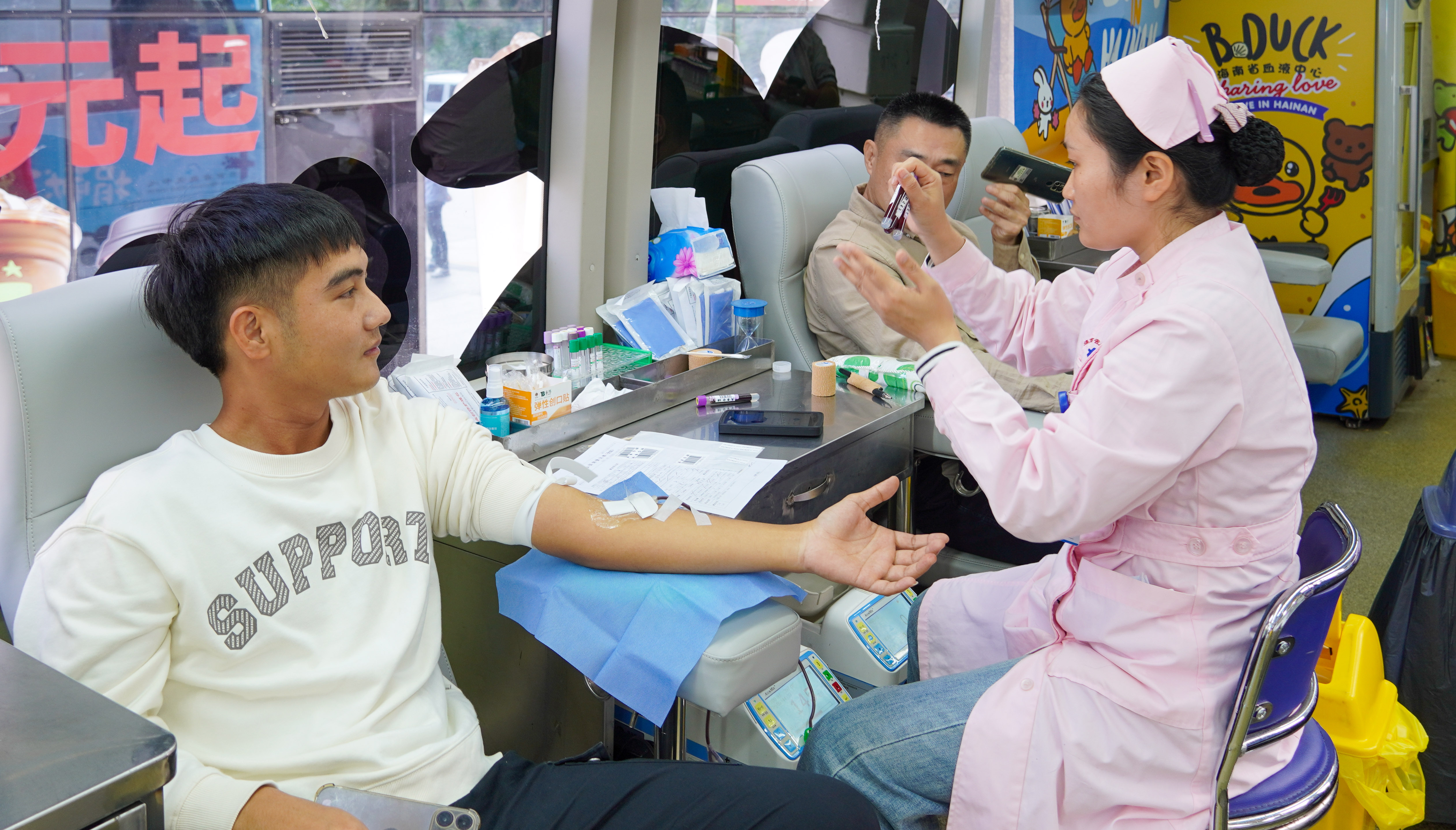 活動現(xiàn)場,參與獻血的員工們在海南省血液中心醫(yī)務(wù)人員的指導(dǎo)下,有序完成信息登記、血壓測量、血液化驗初篩等流程后進行獻血。獻血的隊伍中既有多年堅持無償獻血的“老將”,也有初次參與的“新兵”,從黨員到海南民生燃氣等分子公司的員工,大家以飽滿的熱情加入到這場“熱血”的隊伍中。
